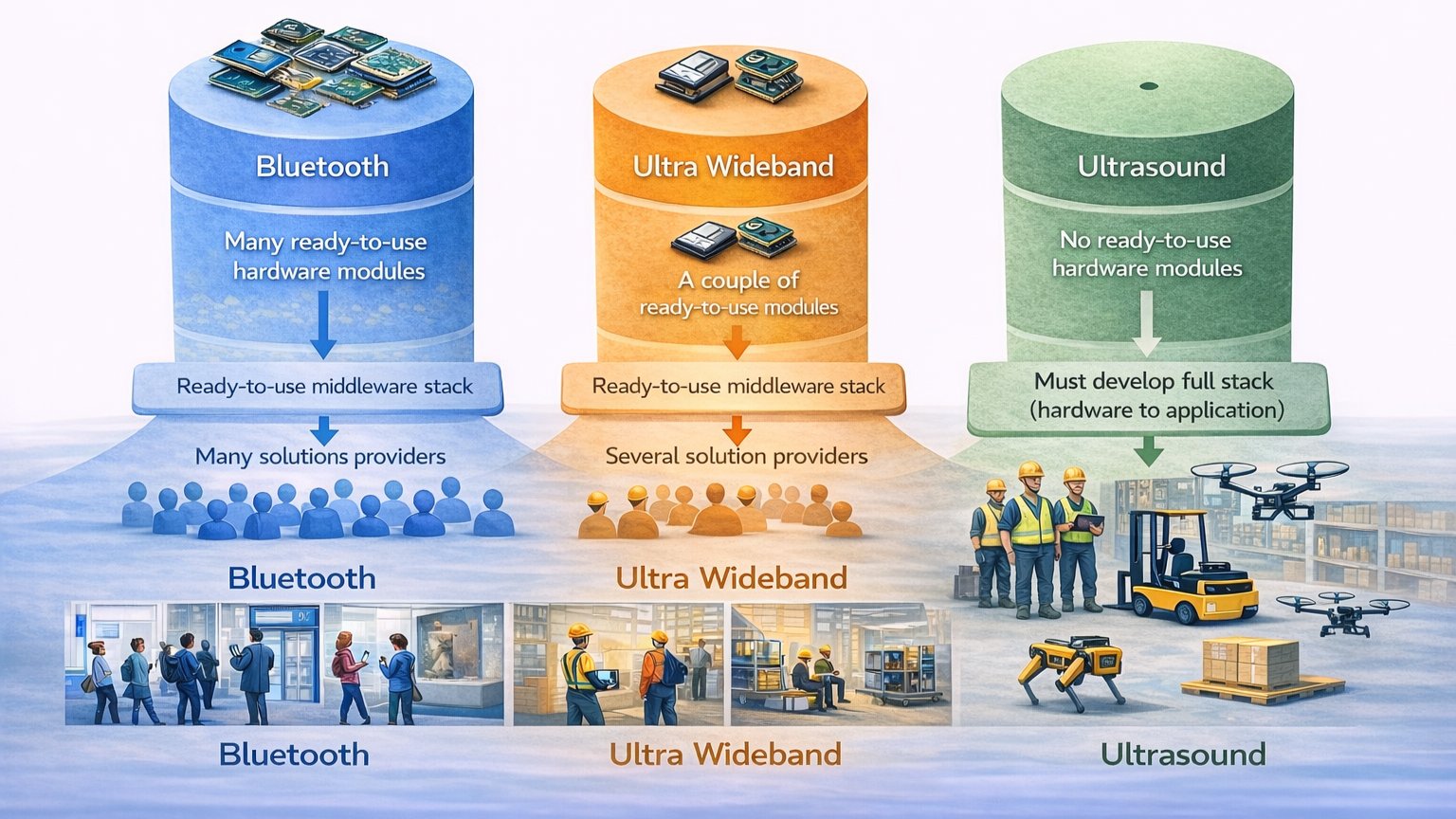Full stack comparison. Bluetooth and UWB benefit from ready-to-use hardware modules and middleware, enabling many solution providers. Ultrasound requires full-stack development, but delivers the highest accuracy and broadest industrial use cases.